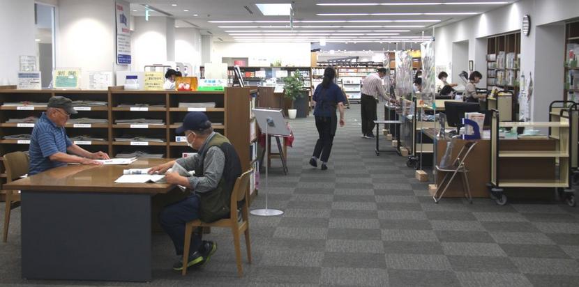 開館再開後、ロビーの椅子の数は減らしたが、新聞閲覧コーナーは従来通り。長弘館長は「長時間の滞在は当面、自粛をお願いしていく」としている。