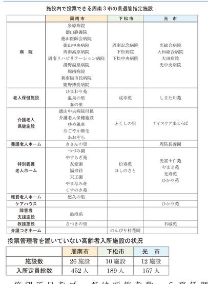 周南3市では48施設があり、入所定員の総数は798人。実に3市で800人近い人たちが少なくとも施設内で投票できず、今回のコロナ騒動のようなことがあれば投票したくてもその機会を奪われることになる。