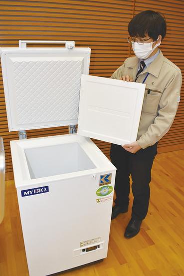 このうちあいぱーく光では新型コロナウイルスワクチン接種対策室の職員らが受け取った。冷凍庫は幅55・7センチ、奥行き55・7センチ、高さ88・7センチ。上部に扉がついている。電動でマイナス65度から75度の間で温度設定ができ、通常は70度で使用する。
