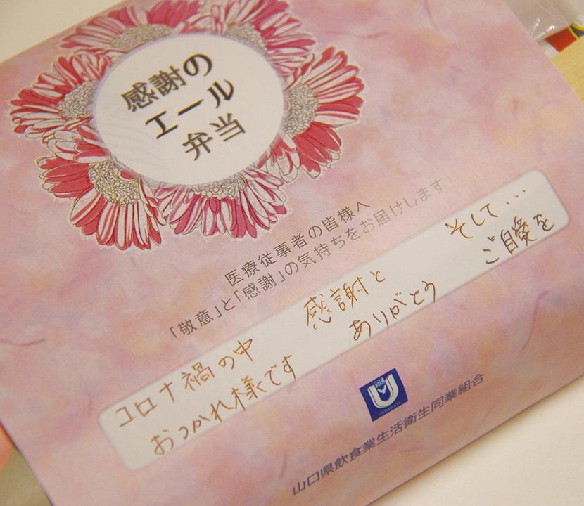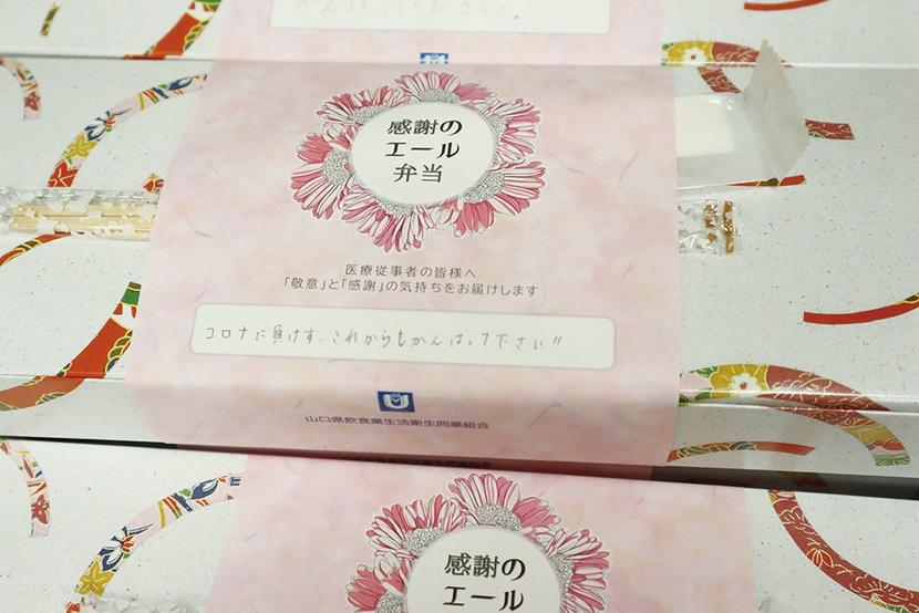 弁当は島田の小蜂▽島田のカフェ・アゴラ▽浅江のカフェステージ・ドンク▽室積村のちどりだいにんぐが手分けをして調製。アゴラは弁当箱に巻くかけ紙に一枚一枚「コロナ禍の中お疲れ様です。感謝とありがとう。そしてご自愛を…」と手書きで書き添えて、医療の最前線で働く人たちに思いを寄せた。