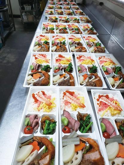 安達組合長は「我々飲食業も厳しいが、それ以上に大変な思いで奮闘されている医療従事者の方に改めてエールを送りたい」、松田さんは「お弁当を食べて少しでも元気になってもらえたら」と話した。