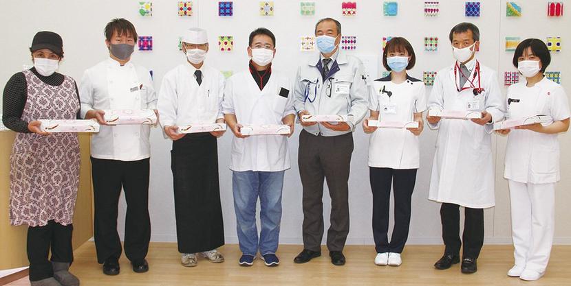 上原支部長は「コロナ禍の中、医療の最前線で私たちの安全を守って下さる皆さんに、ささやかながら感謝の気持ちを届けたい」とあいさつし、佐古課長が「皆さんの温かい善意に心から感謝し、おいしくいただきます」とお礼を述べた。