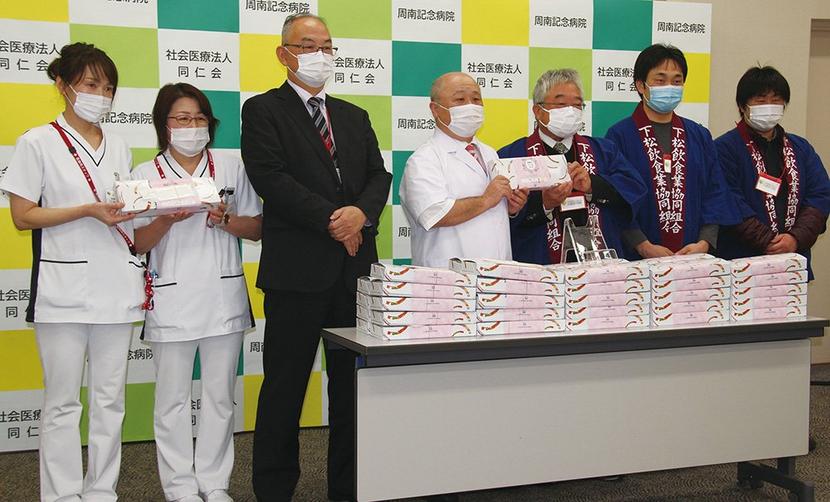 下松市では、県飲食業生活衛生同業組合下松支部(原田真雄支部長、102店)が生野屋南の周南記念病院(橋谷田博院長、250床)を訪れて弁当50箱を贈った。