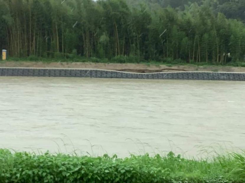 傾いた島田川の護岸(読者提供・14日午後2時ごろ撮影)