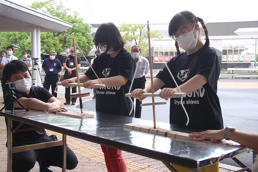 続いて同館玄関近くで採火式があり、小型のまいぎり式火起こし器で同チームの中谷優真さん(17)、河村優奈さん(18)、藤田真尋さん(18)、貞安初音さん(22)が火起こしに挑んだが悪戦苦闘。市職員が火打ち石で火を起こしてカバーした。