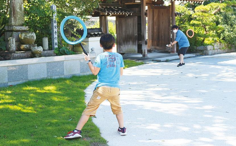 • 境内でバドミントンをする子どもと河本さん(お寺で地域いろどり食堂)