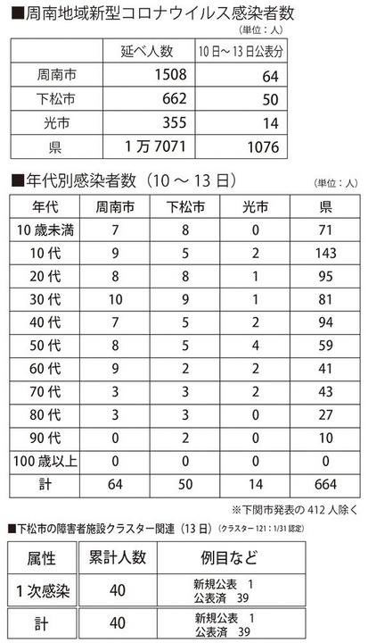 [13日]県内で233人が感染した。周南市は16人、下松市は10人、光市は1人。周南市の16人は10代5人、20代1人、30代2人、40代2人、50代1人、60代1人、70代3人、80代1人▽下松市の10人は、10歳未満2人、20代3人、40代2人、50代1人、60代1人、90代1人▽光市は50代2人。