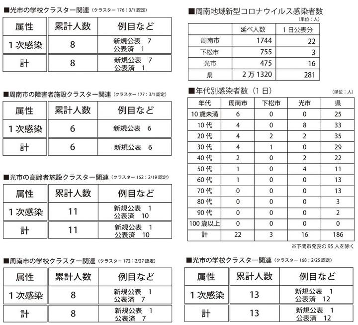 2月27日に認定された周南市の学校クラスターでも生徒1人の感染がわかり、感染者の累計は8人になった。生徒は周南市在住の男性で10代。軽症。