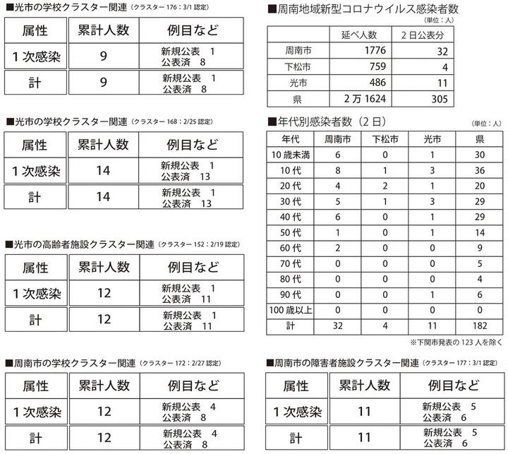 地域その他山口県県などは2日、新型コロナウイルスに305人が感染したと発表した。周南地域では、周南市が32人、下松市が4人、光市が11人。累計は周南市が1,776人、下松市が759人、光市が486人、県内は延べ2万1,624人になった。