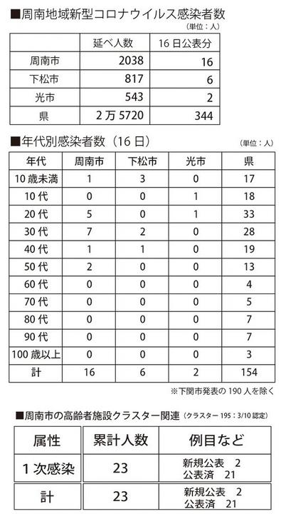 地域その他山口県などは16日、新型コロナウイルスに344人が感染したと発表した。周南地域では、周南市が16人、下松市が6人、光市が2人で、累計は、周南市が2,038人、下松市は817人、光市は543人、県内は延べ2万5,720人になった。