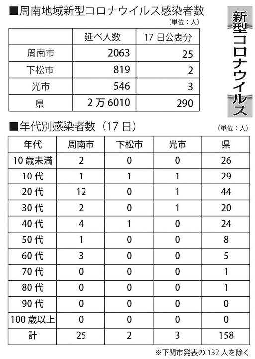 地域その他山口県などは17日、新型コロナウイルスに290人が感染したと発表した。周南地域は、周南市が25人、下松市が2人、光市が3人だった。累計は、周南市が2,063人、下松市が819人、光市が546人、県内は2万6,010人になった。
