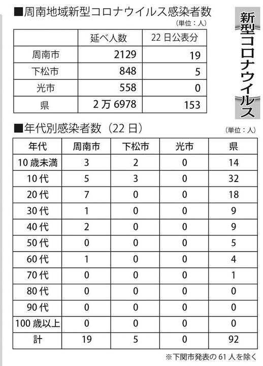 地域その他山口県などは22日、新型コロナウイルスに153人が感染したと発表した。周南地域では、周南市が19人、下松市が5人で、光市は7日から15日ぶりに感染者がなかった。周南市の累計は2,129人、下松市は848人、県内は2万6,978人になった。