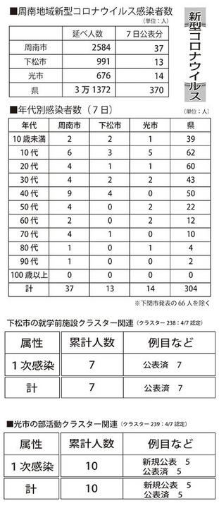 地域その他山口県などは7日、新型コロナウイルスに370人が感染したと発表した。周南市が37人、下松市が13人、光市が14人で、累計は周南市が2,584人、下松市が991人、光市が676人、県内は延べ3万1,372人になった。