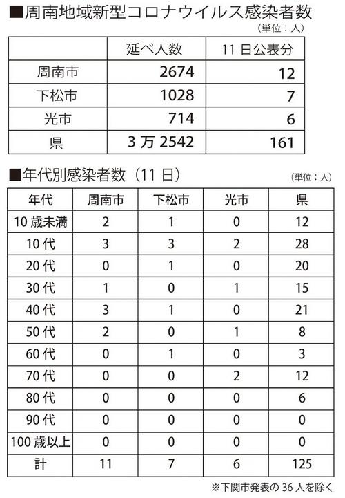 地域その他山口県などは11日、新型コロナウイルスに161人が感染したと発表した。周南市が12人、下松市が7人、光市が6人で、累計は周南市が2,674人、下松市が1,028人、光市が714人、県内は延べ3万2,542人になった。