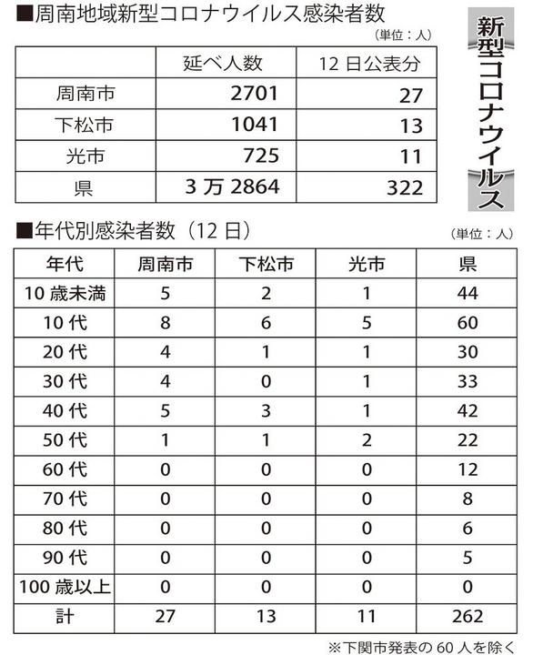 地域その他山口県などは12日、新型コロナウイルスに322人が感染したと発表した。周南市が27人、下松市が13人、光市が11人で、累計は周南市が2,701人、下松市が1,041人、光市が725人、県内は延べ3万2,864人になった。
