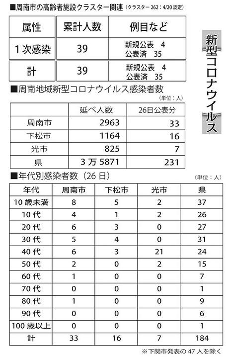 地域その他山口県などは26日、新型コロナウイルスに231人が感染したと発表した。周南市が33人、下松市が16人、光市が7人で、累計は周南市が2,963人、下松市が1,164人、光市が825人、県内は延べ3万5,871人になった。