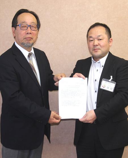 要請書を持つ熊野代表(左)と藤田課長