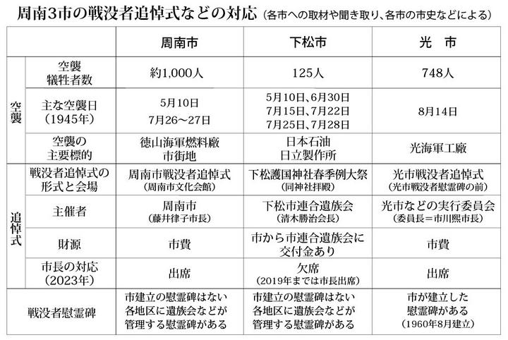 3市のうち周南市は市の主催で、光市は市長が委員長を務める実行委員会の主催で「戦没者追悼式」を毎年開いている。半面、下松市には市が関与する追悼式はなく、過去にも開かれたことがない。なぜだろうか。