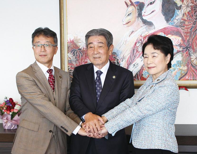 座談会で握手する左から芳岡光市長、国井下松市長、藤井周南市長