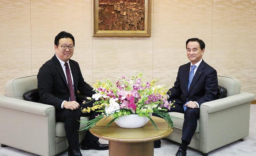 中島拓㈱新周南新聞社代表取締役社長(左)と村岡嗣政知事