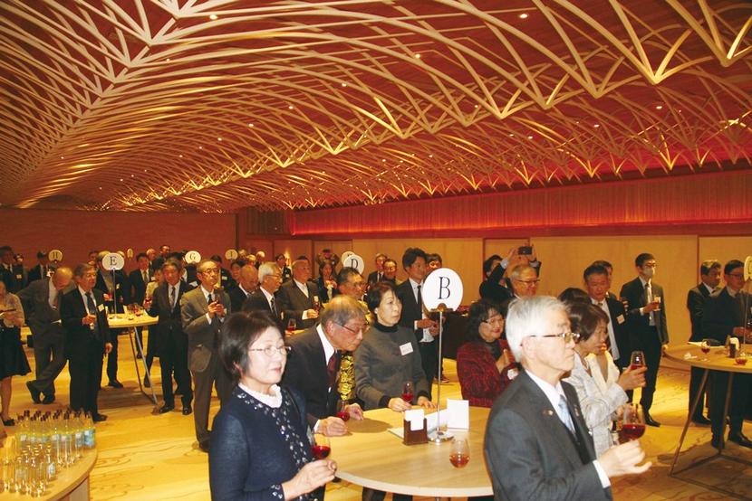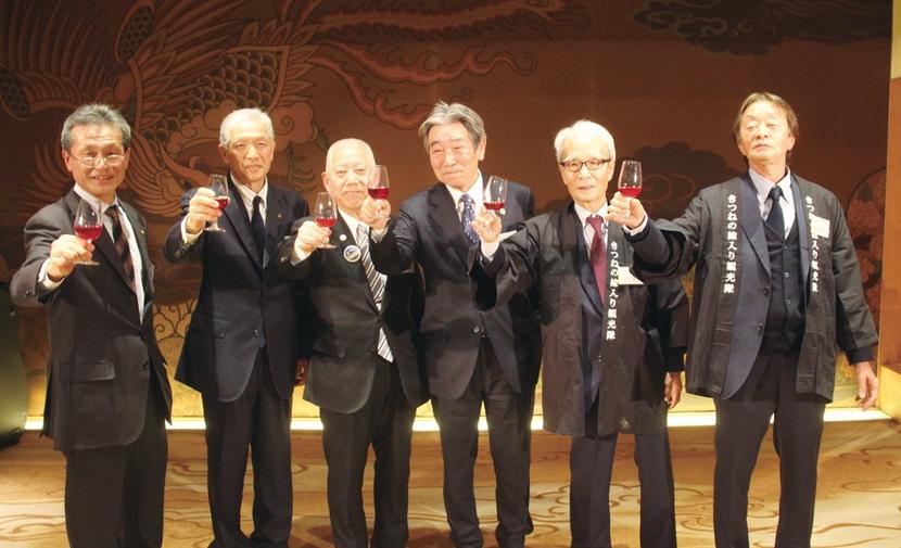 乾杯する細越町長、国井市長、中村理事長、金織社長(左から3人目から右へ)