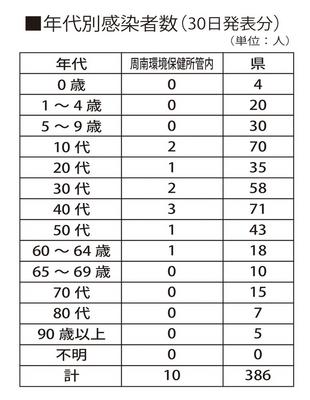 山口県などは30日、新型コロナウイルスに386人が感染したと発表した。周南環境保健所管内(周南、下松、光市)は10人で、保健所管内で一番多かったのは下関の52...