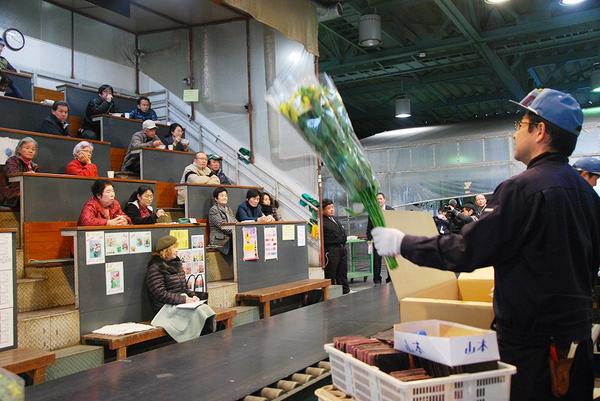 周南市鼓海の市地方卸売市場で4日、花き部の初競りが開かれ、生花店などの約40人を前に競り人たちの威勢のいい声が飛び交った。 まず市の弘中基之経済産業部長、主...