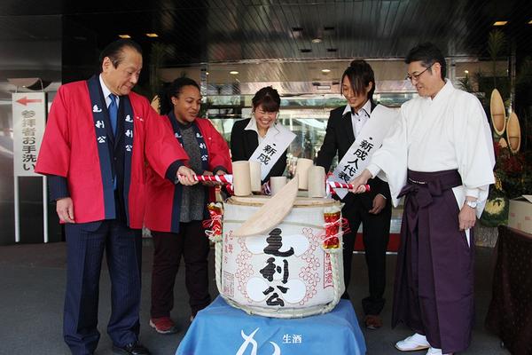 【周南市】新成人、外国人が鏡開き 遠石八幡宮・山縣本店が新酒奉納