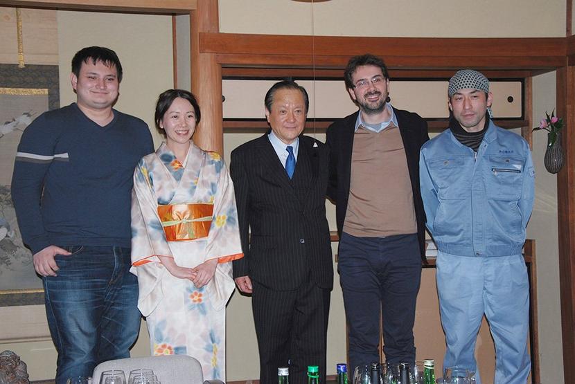 日本酒を味わうロブションさん(左)とヴァンティエールさん