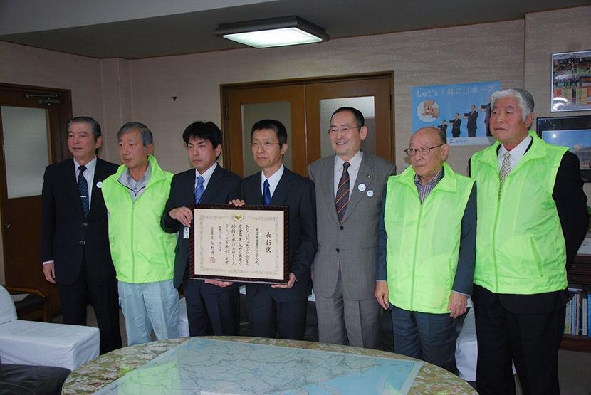 左から中馬好行教育長、守田、真山、相川さん、市長、中川、松並さん