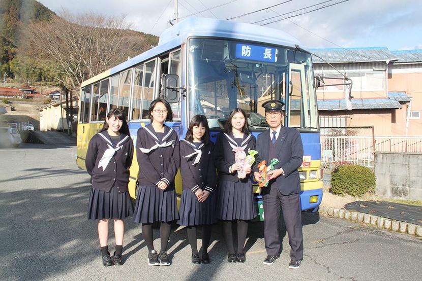 “バレンタインデー”の14日、周南市須々万の徳山高徳山北分校(倉田伸治校長、26人)の生徒会(石川実咲会長)が日ごろの安全運転に感謝しようとスクールバスを運行...
