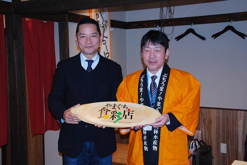 周南市平和通の居酒屋「ふくの鳥」徳山店が県内産の農水産物を使用したメニューを提供する“やまぐち食彩店”に選ばれ、20日、同店で開設式があった。 やまぐち食彩...
