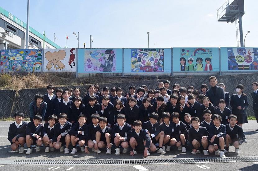 卒業を前に、周南市の久米小(河村克郎校長)の6年生の2クラス61人がクラスごとに描いた絵画計2枚が山陽自動車道の徳山東インターチェンジの遮音壁に掲げられ、10...