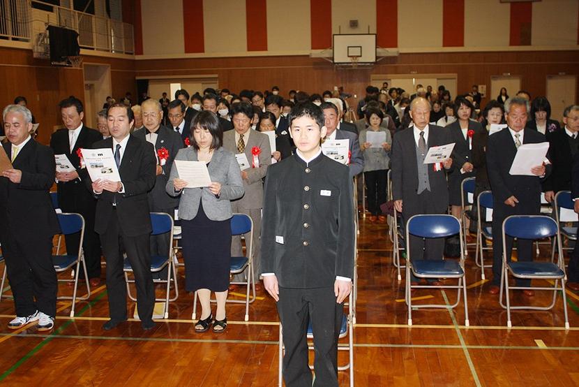 周南市の中須中(足達滋校長)と2015年度から児童がいなくなって自然休校になっている中須小の休校式が24日、中須中体育館で開かれ、住民や元校長など150人が参...