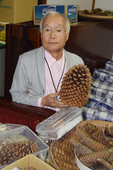 世界一大きな松かさを持つ山本さん