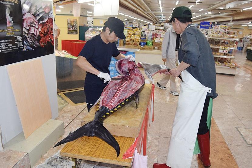 周南市の徳山商店街の銀南街地下にあるスーパー銀南の鮮魚店、魚銀(田中康男店長)が毎週水曜午前11時半からお客さんの目の前で体長1メートル以上もあるマグロを解体...