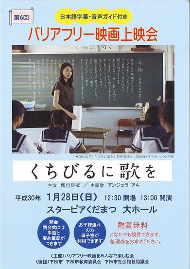 下松市のバリアフリー映画をみんなで楽しむ会(清水良昭代表)は28日午後1時からスターピアくだまつ大ホールで新垣結衣主演の2015年の映画「くちびるに歌を」を上...
