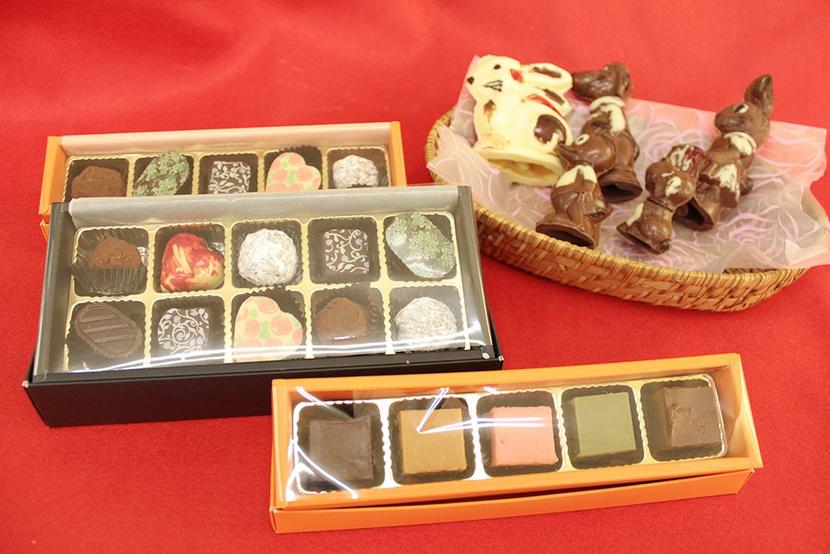 手前は生チョコ、左は10粒入りと5粒入りのトリュフ、右奥は動物型チョコレート