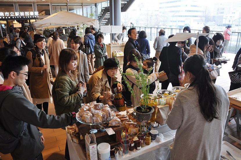 周南市の徳山商店街などで2カ月に1回ていど続けられている「徳山あちこちマルシェ」が26日、新徳山駅ビルの徳山駅前賑わい交流施設が開館してからは初めて開かれ、県...