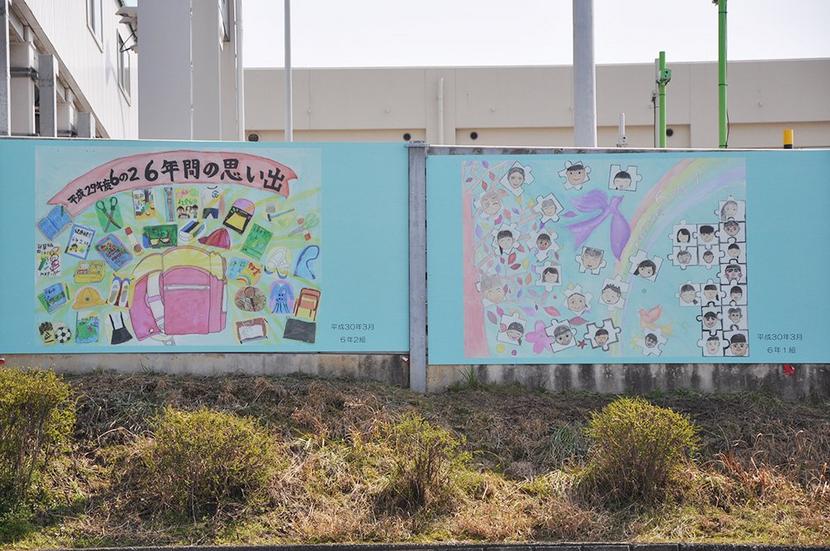 周南市久米の山陽自動車道徳山東インターチェンジ(IC)入り口の遮音壁の市道側に13日、近くの久米小(石田勝己校長、460人)の6年生57人が卒業制作で描いた絵...