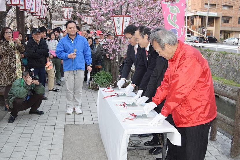 桜の開花シーズンを迎え、周南市橋本町の桜の名所の一つ、東川緑地公園の揚柳橋近くで24日、東川ぼんぼりまつりの点灯式があり、鏡開きなどで祝った。豚汁と焼き鳥も振...