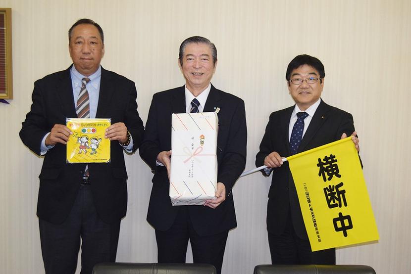 • 贈呈式に出席した左から大嶋支部長、中馬教育長、鷺川副支部長