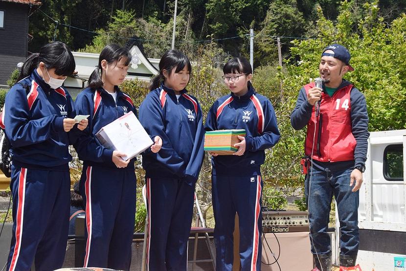 抽選会を手伝う中学生