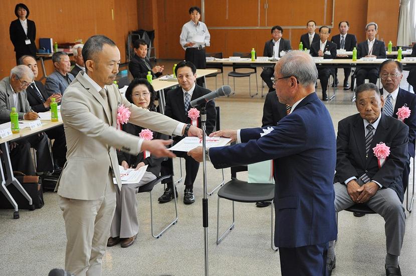 田中会長(右)から表彰状を受け取る受賞者