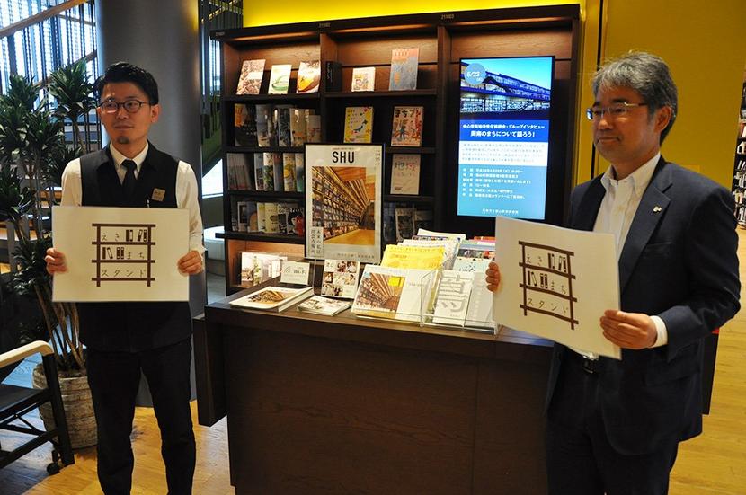 「えき・まちスタンド」の前の桜沢館長(左)と西本部会長