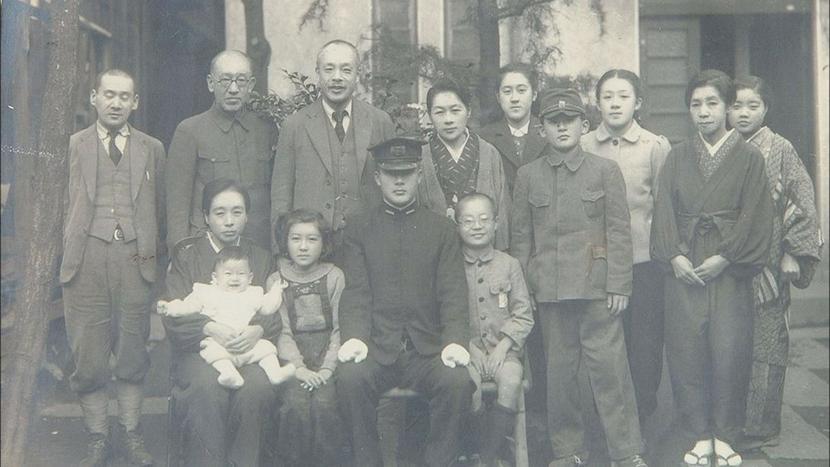 装置と一緒に展示されている塚本少尉と家族の写真=同