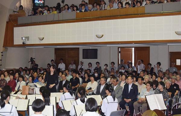 周南市議会は新庁舎完成に伴って新しい議場に移ることから24日、これまでの議場で最初で最後となる「議場コンサート」を開き、議員と市民350人が徳山高吹奏楽部と周...