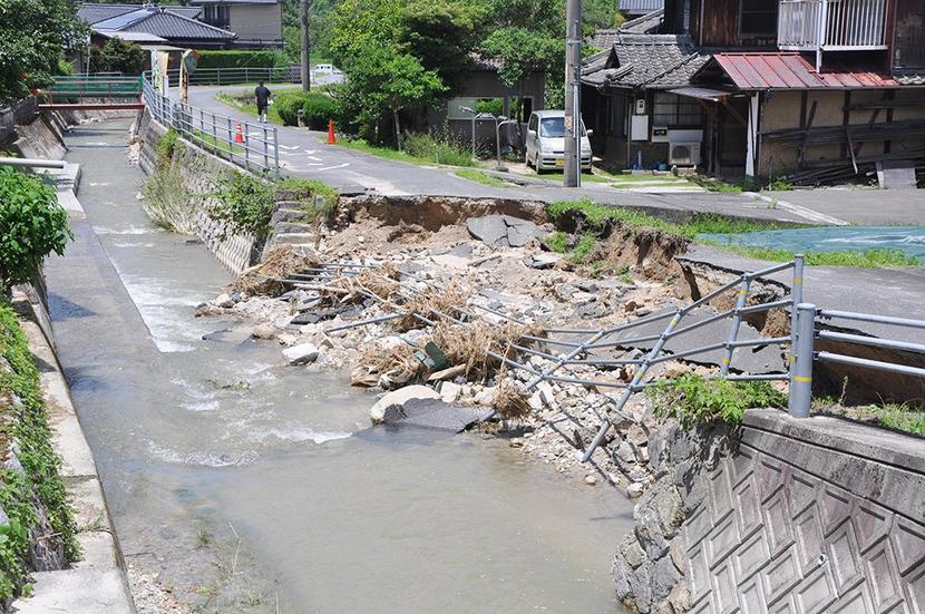 崩落した道路=三丘地区の小松原