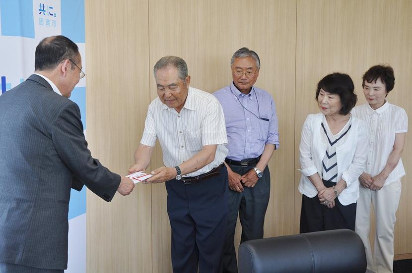 木村市長に目録を渡す左から高橋、足立、清木、藤村さん