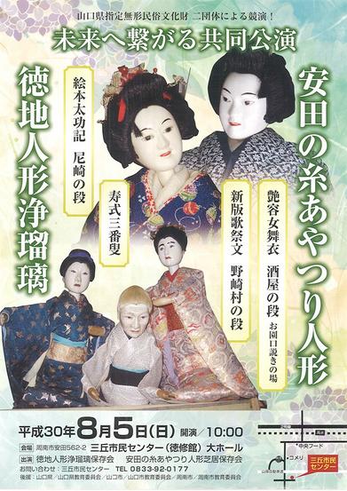 ともに県無形民俗文化財に指定されている周南市熊毛地域に伝わる「安田の糸あやつり人形芝居」と山口市徳地の「徳地人形浄瑠璃」が共演する「未来へ繋(つな)がる共同公...